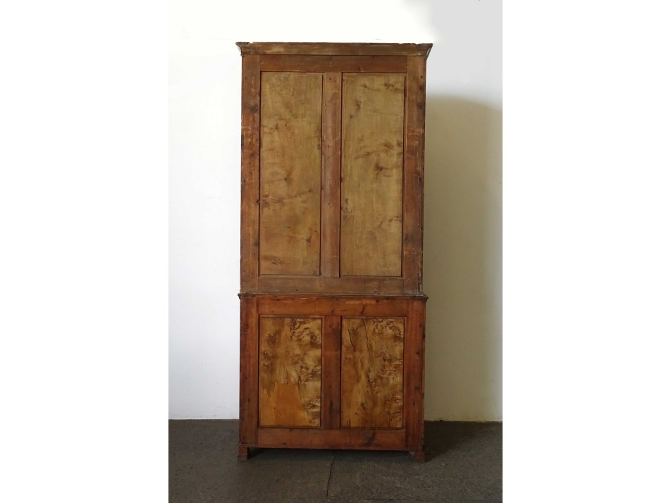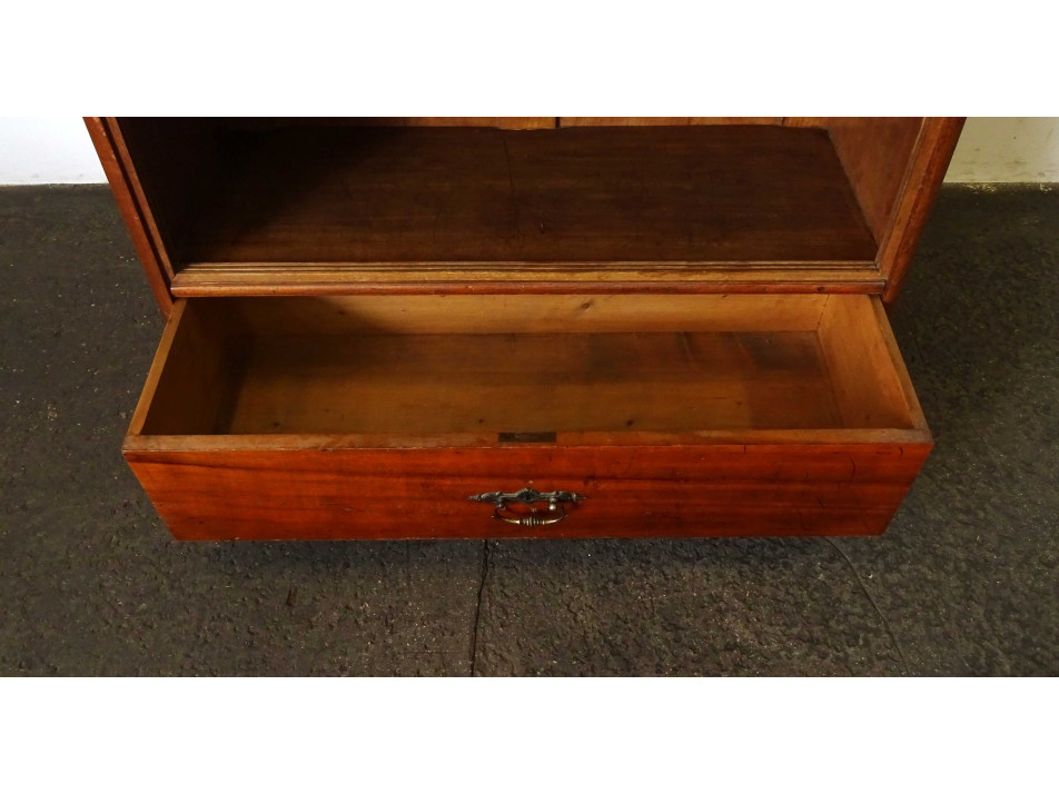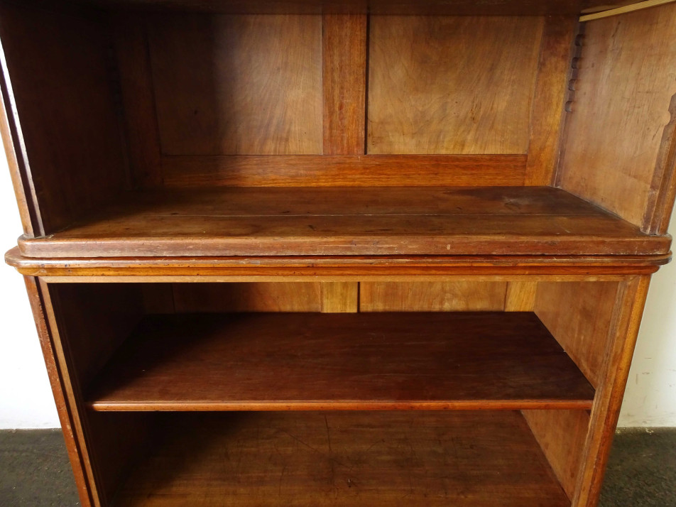 Régi, két részből álló, nyitott, 6 polcos résszel rendelkező könyvespolc, könyvszekrény. Alsó része szintén polcos, eredetileg üveg tolóajtóval rendelkezett, ez már hiányzik. Hátoldala csapolt, deszkázott.