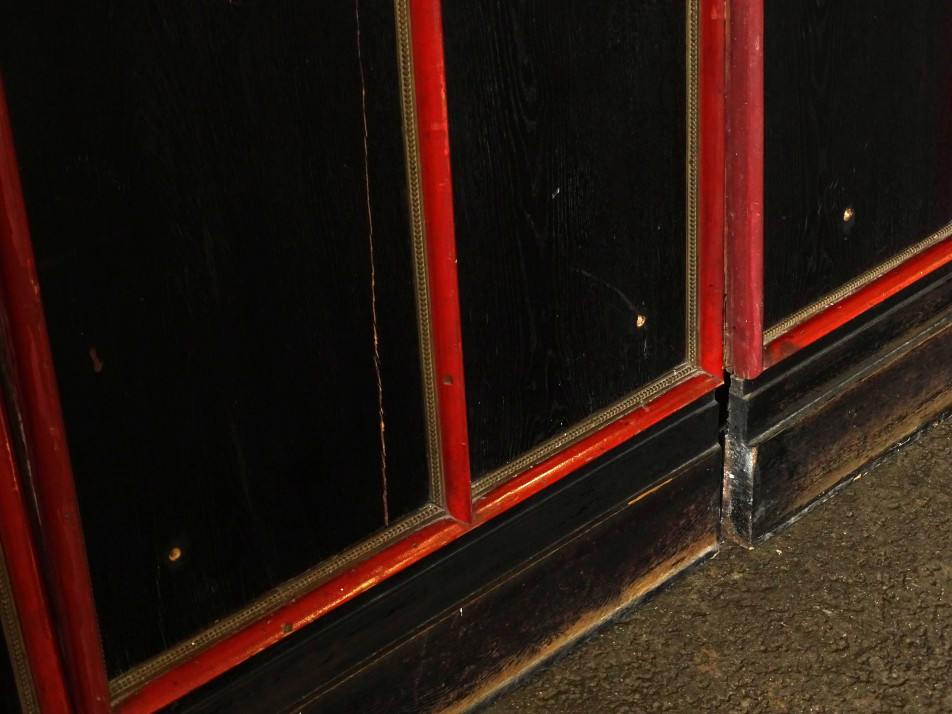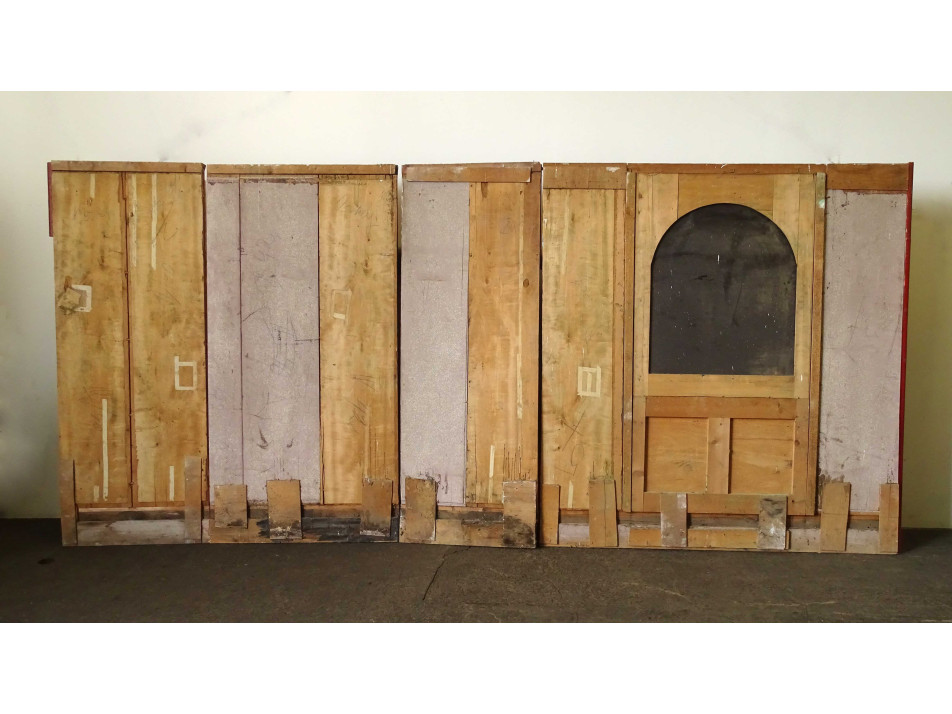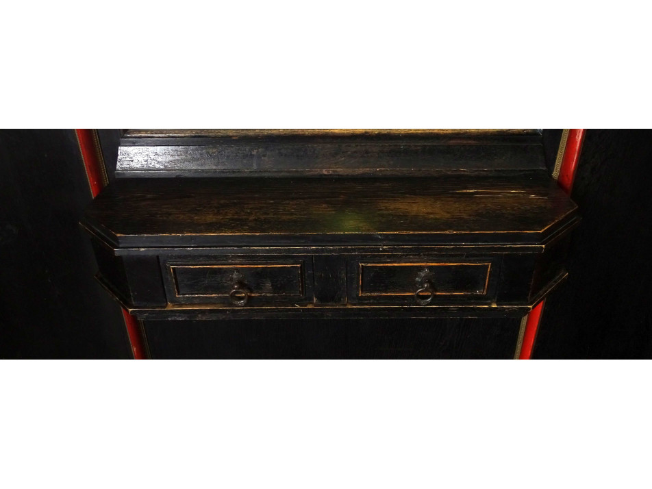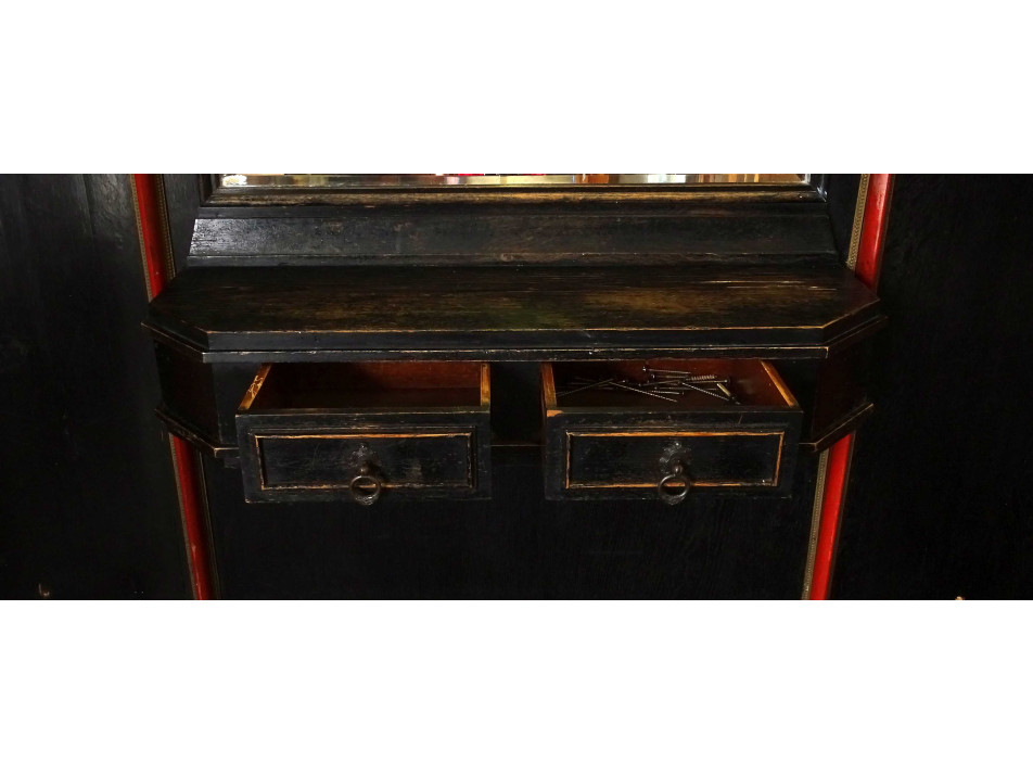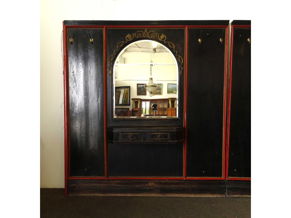 Antik, nagyméretű, négy eleből álló, fekete - arany - vörös színű, tükrös Kozma Lajos előszobafal. A bal szélén lévő hármas tagolású elemen ívelt tetejű tükör, alatta két fiókos kis asztalka található.