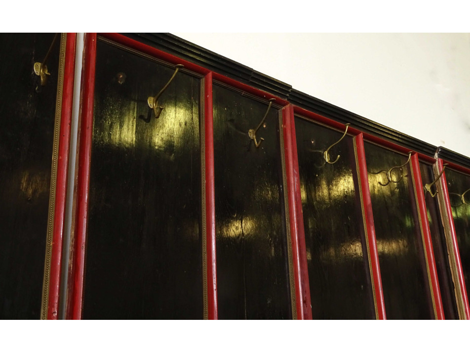 Antik nagyméretű, négy elemes, fekete tükrös, Kozma Lajos előszoba fal, fogas 445 cm
