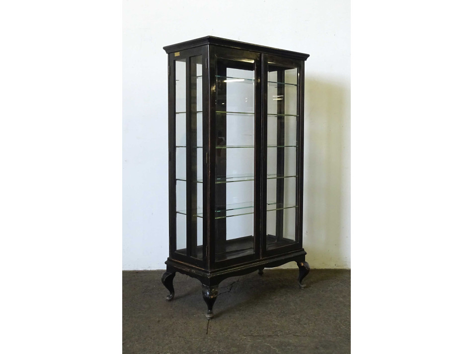 Antik, üvegajtós, üvegpolcos, mindkét oldalról nyitható, fekete színű gyógyszertári vitrin, patika bútor. Ajtajaiban és oldalsó üvegeiben metszett üvegtáblák találhatók. Az egyik üvegpolca hiányzik, de ez könnyen pótolható.