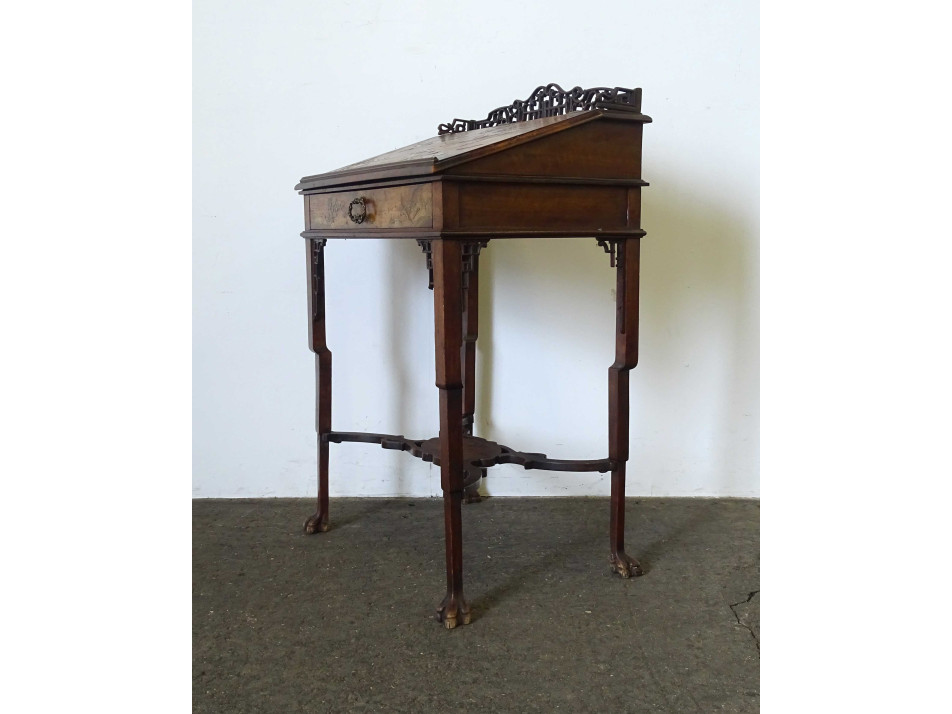 Antik, gyönyörű, gazdagon faragott, keleti, kínai fiókos kis asztal, íróasztal, szekreter. A bútor felnyitható fedele és fiókja domború intarziával gazdagon díszített, tetején nagyméretű, igen részletgazdag gyönyörű vizimadarakat és virágokat ábrázoló intarzia díszítés található. Tetején és a lábak csatlakozásánál áttört faragványok díszítik. Ezek közül több is sérült, hiányos. A bútoron kisebb furnérhibák találhatók .