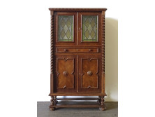 A szekrény két részes, felső része üveges, kulcsos, eredeti záras. Alja polcos, ajtós, 1-1 fiókkal.