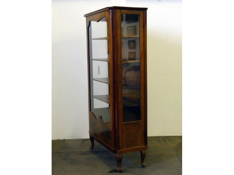 Antik, szép állapotú, polcos nipp tartó vitrin. A vitrin oldalt nyíló ajtókkal, zárral rendelkezik. Kulcsa nincsen. Az üveges rész alatt, középen, diógyökér furnér díszítés látható. Azonnal enteriőrbe helyezhető, gyönyörű darab!