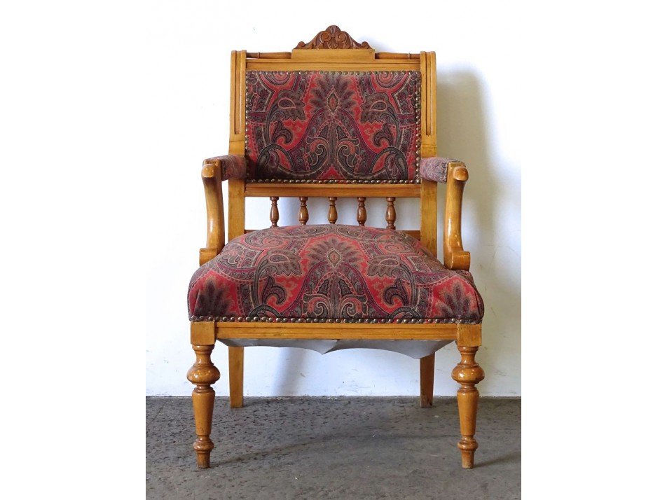 Régi faragott támlás, karfás szék. Alacsony fotel. Ülőfelülete epedarugós. A támla faragott csúcsban végződik.