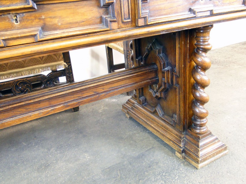 - 1 darab térbe helyezhető csavart oszlopos, faragványokkal gazdagon díszített kazettás, három fiókos masszív, nagyméretű íróasztal. A fiókok zárral rendelkeznek ( 2 db ) ( magassága: 80 cm, szélessége: 181 cm, mélysége: 80,5 cm. )