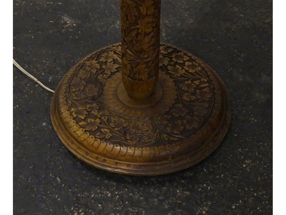 Régi, gyönyörű, levél motívumokkal gazdagon díszített faragott állólámpa, működő állapotban. Rajta nagyméretű lámpaernyő.
