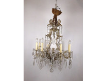 Antik, szecessziós, szép állapotú hét égős, láncokon lógó rézlemez csillár. Áttört réz elemekkel díszített. Nagy méretű (E27) izzó való a porcelánbetétes réz foglalatokba.