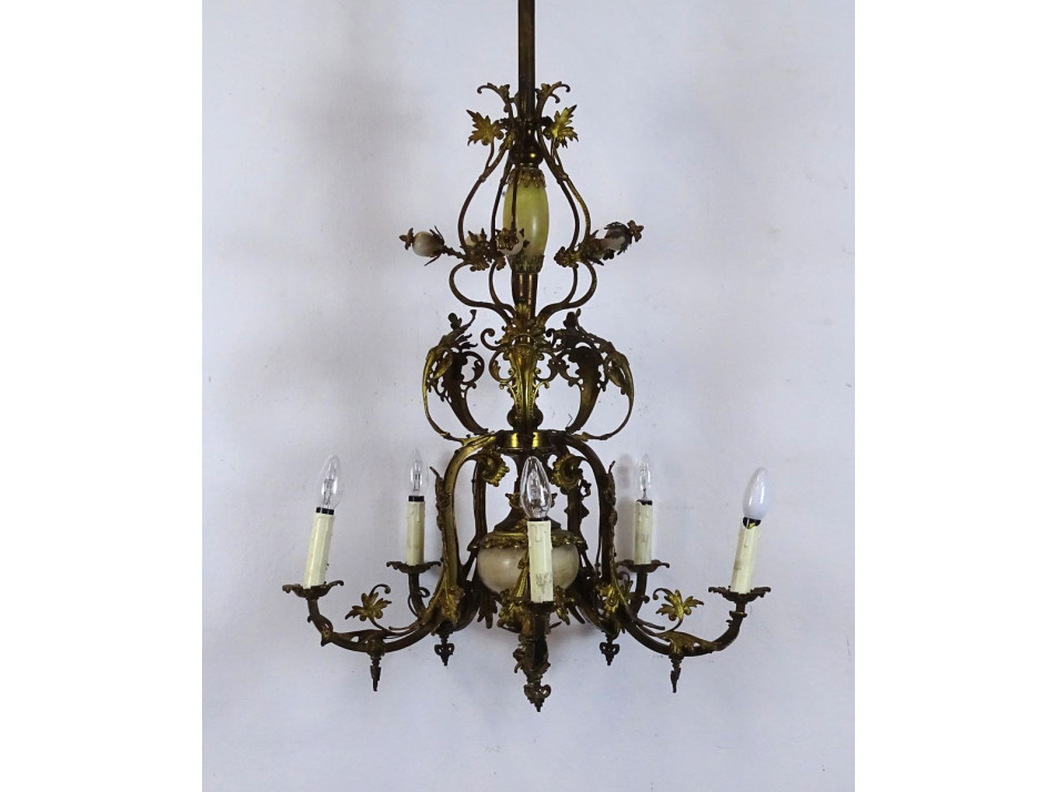 Nagyméretű antik ötkarú tűzarany csillár. A karok gyertyákban végződnek, kisméretű (E14) izzó való bele. A tűzaranyozott réz testet márvány elemek díszítik.