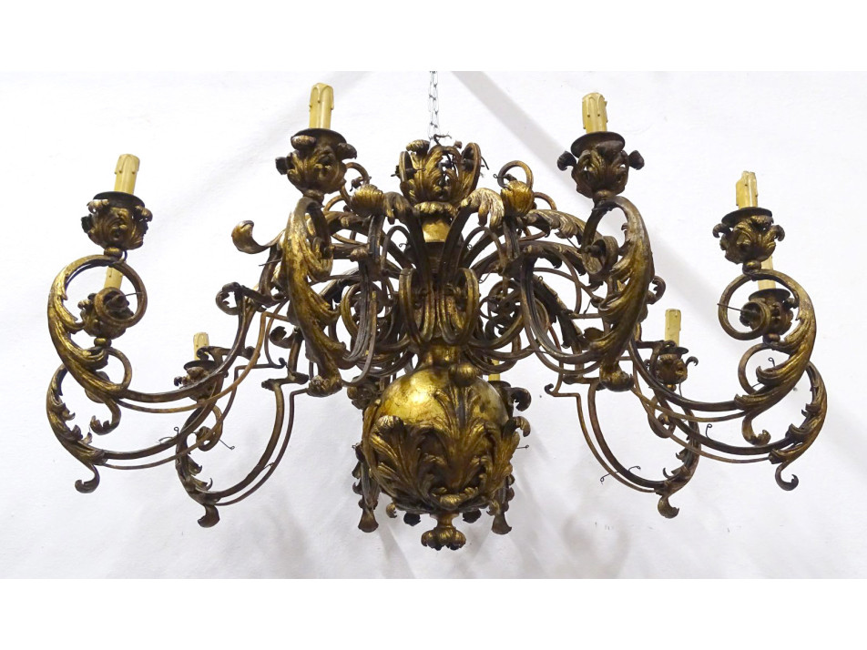 Gyönyörű, antik kézi kovácsolt tízkaros patinás tűzarany csillár. Egy pár duplaégős falikar is tartozik hozzá. A karok papírmasé gyertyákban végződnek. Összesen 14 darab kisméretű (E14) izzó kell hozzá.