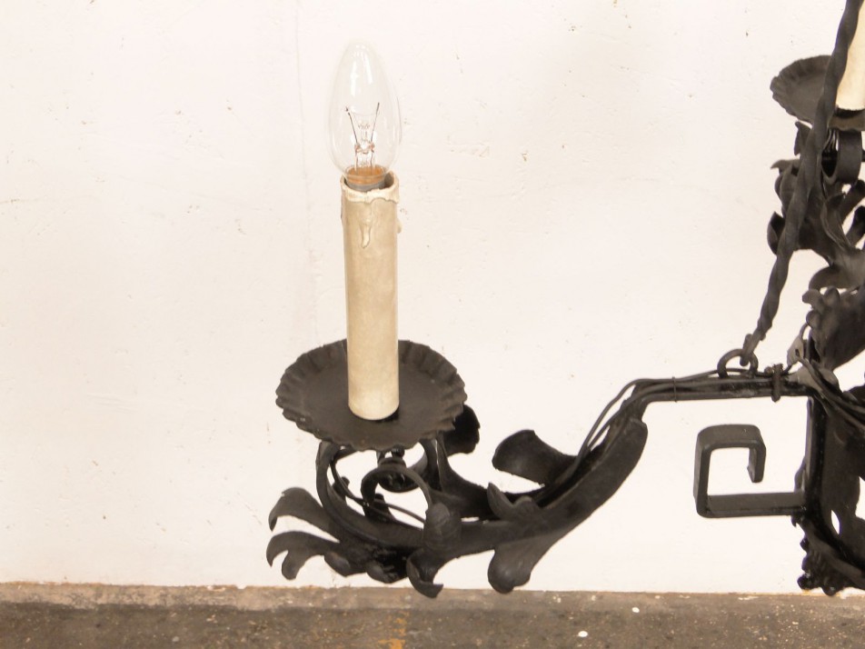 Újravezetéklet, használható állapotban lévő szépen megmunkált, kovácsoltvasból készült, igényes mennyezeti lámpa, csillár. A karok papírmasé gyertyákban végződnek, kisméretű izzó való bele.