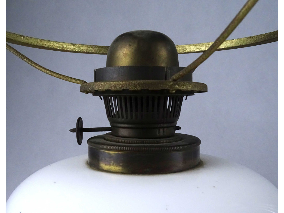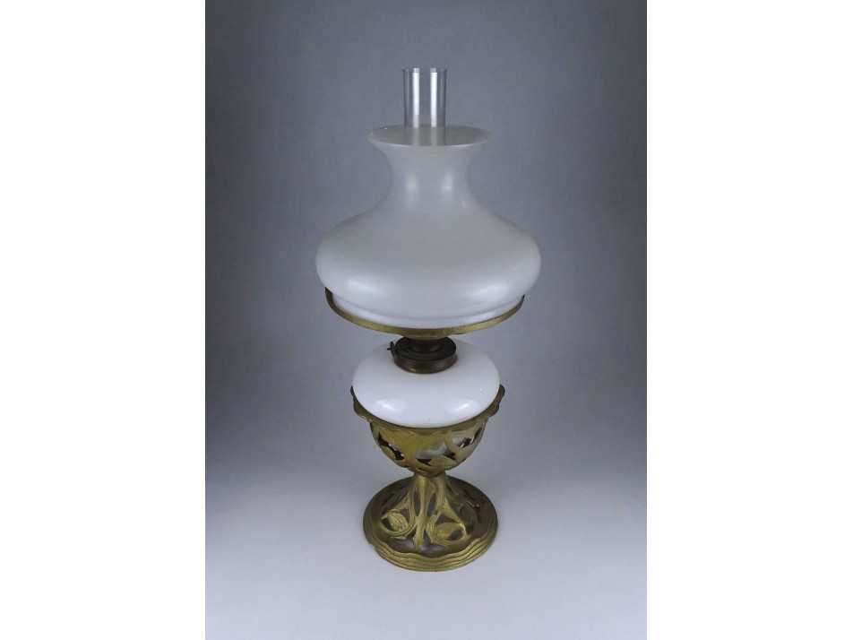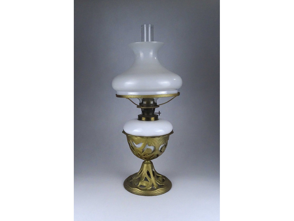 Antik, hibátlan állapotú, szecessziós motívumokkal díszített, arany színűre festett öntöttvas talpon álló, fehér üveg testű petróleumlámpa, 20 cm átmérőjű tejüveg búrával és hibátlan cilinderrel.