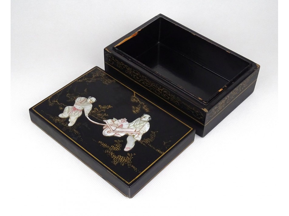 Nagyon régi, fekete színű lakkdoboz, tetején csiszolt kagylódíszítés, japán emberábrázolás.
