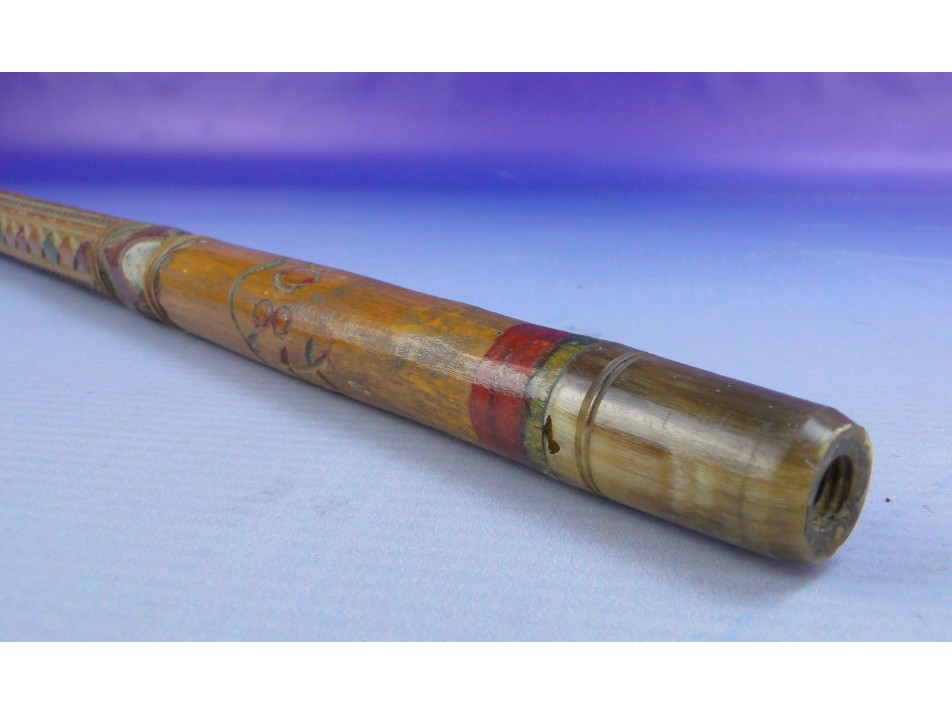 Antik, hibátlan állapotú, datált, dúsan faragott színes, festett pipa szár. A szár végén menetes szipka található.