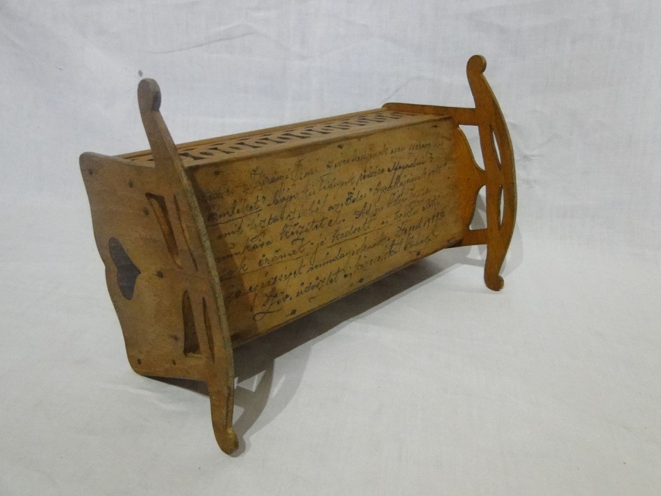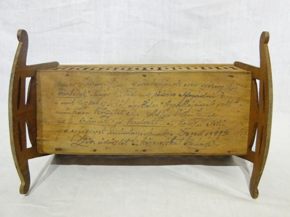 Miniatűr bölcső, benne trikolor magyar zászlós szív betéttel. A bölcső alján belülről és hátulról egy datált SZEGED 1949. III. 30-as magán jellegű ajándékozási szöveg, alján ugyanez a szegedi asztalos felirata: