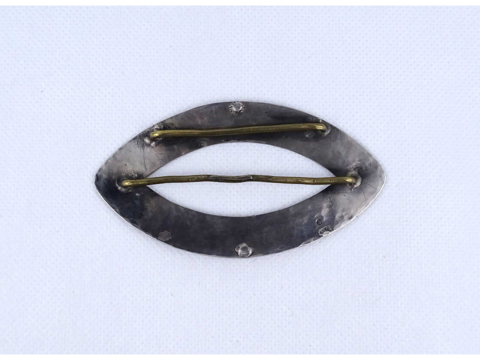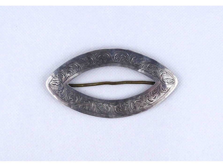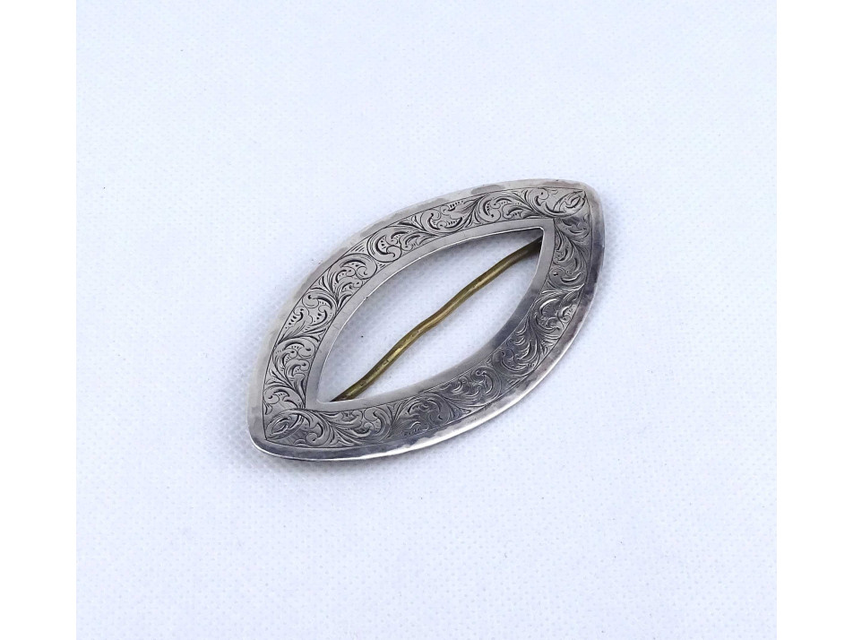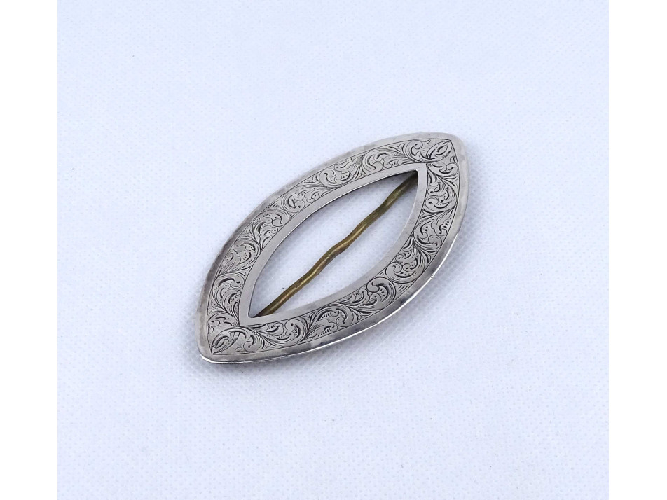 Antik, szép állapotú, vésett levélmintákkal díszített, jelzett ezüst csat, ruhacsat, övcsat. Maximum 5.8 cm széles öv fűzhető át rajta. A csat előlapja ezüst, de a bujtatók sárgarézből készültek.