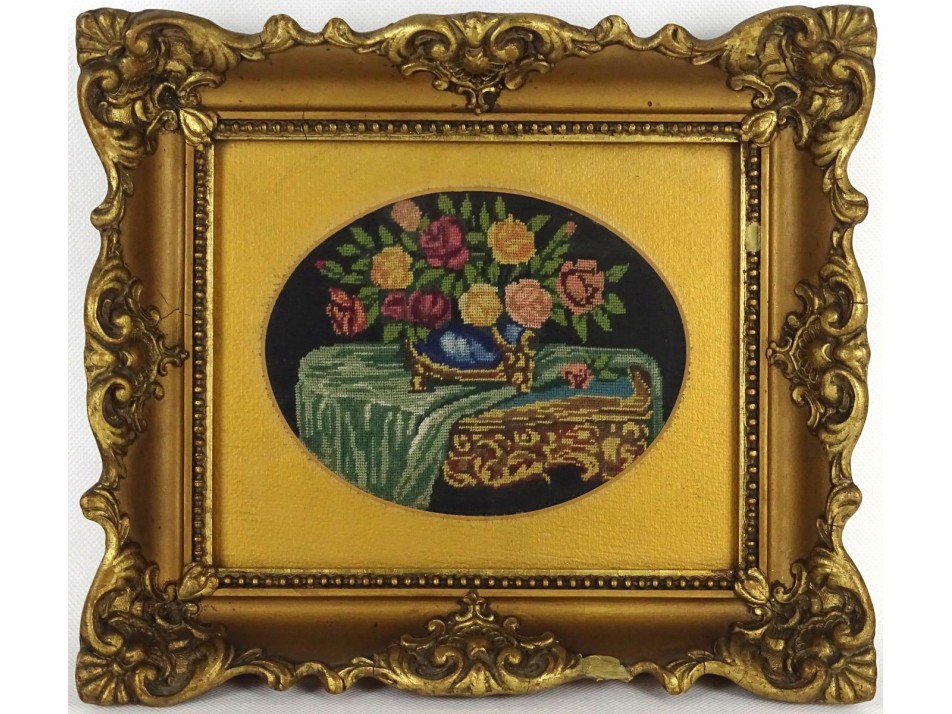 Asztali virágcsendélet régi tűgobelin Blonel keretben 26 x30 cm