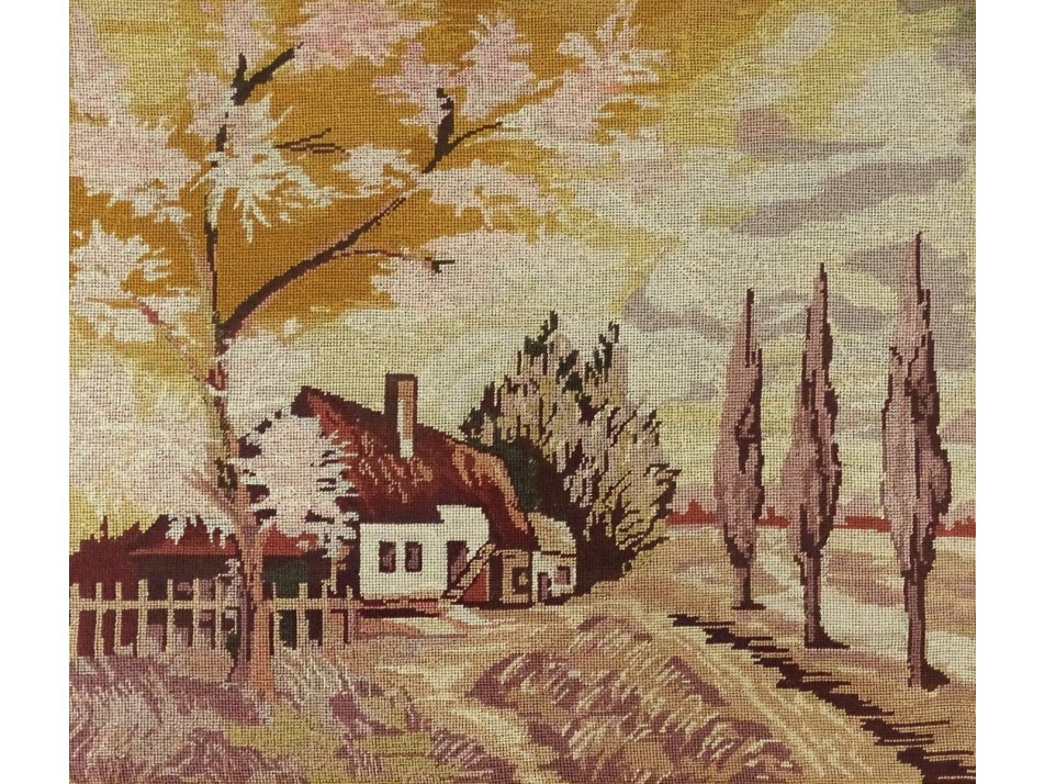 Régi mahagóni keretben, üveglap mögött, arany színű paszpartuban található régi kézimunka, tűgobelin, tájkép tanyával, nyárfasorral.