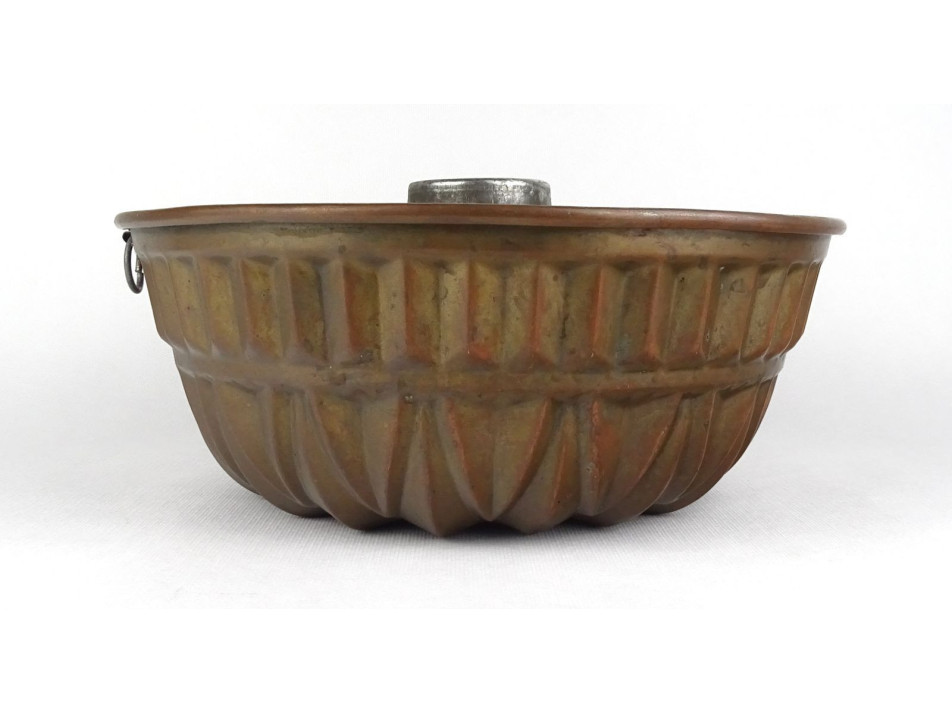 Antik nagy méretű konyhai, cukrászati eszköz. Akasztási lehetőséggel rendelkező sütemény sütő forma. Belső felülete ónozott. Kuglófforma.