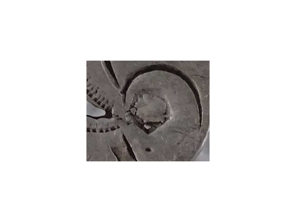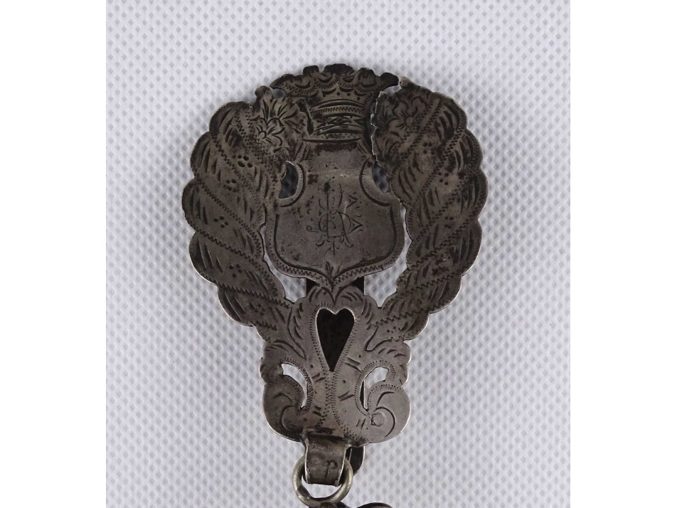 Antik, szép állapotú, vésetekkel díszített, koronás, monogramos házmaster kulcstartó. Rajta 1937-ig használt, jobbra néző 4-es Diána fejes, 750-es finomság jelzés, mellette a "P" hivataljegy és az " SJ " mesterjegy látható.