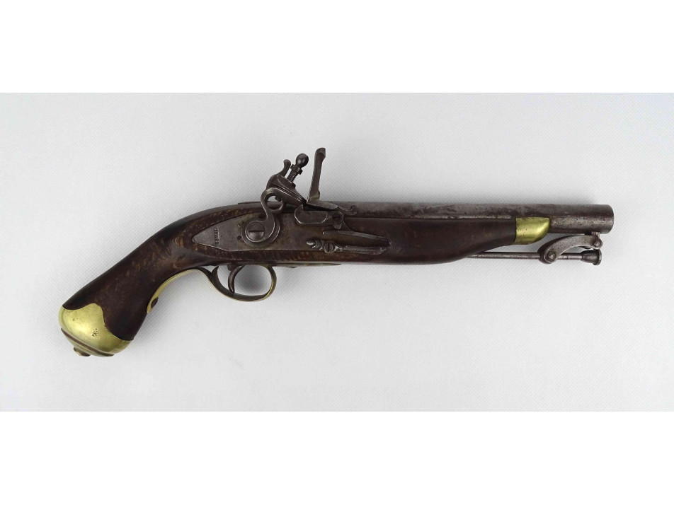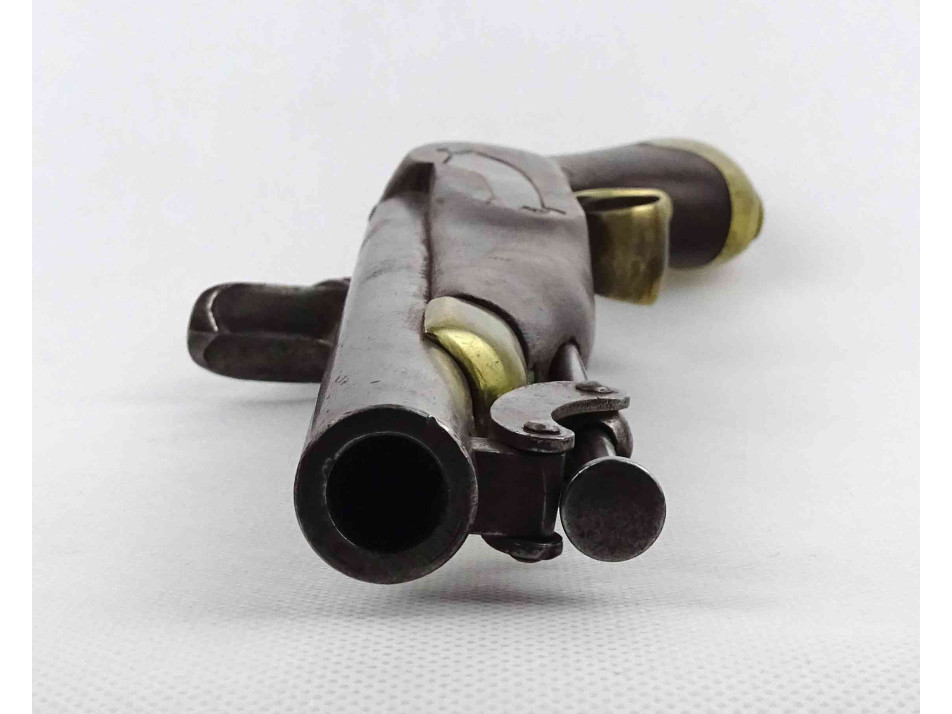 Antik jelzett angol elöltöltős feketelőporos pisztoly, szép állapotú fa ágyazattal, kovácsoltvas szerkezettel az 1800-as évekből.