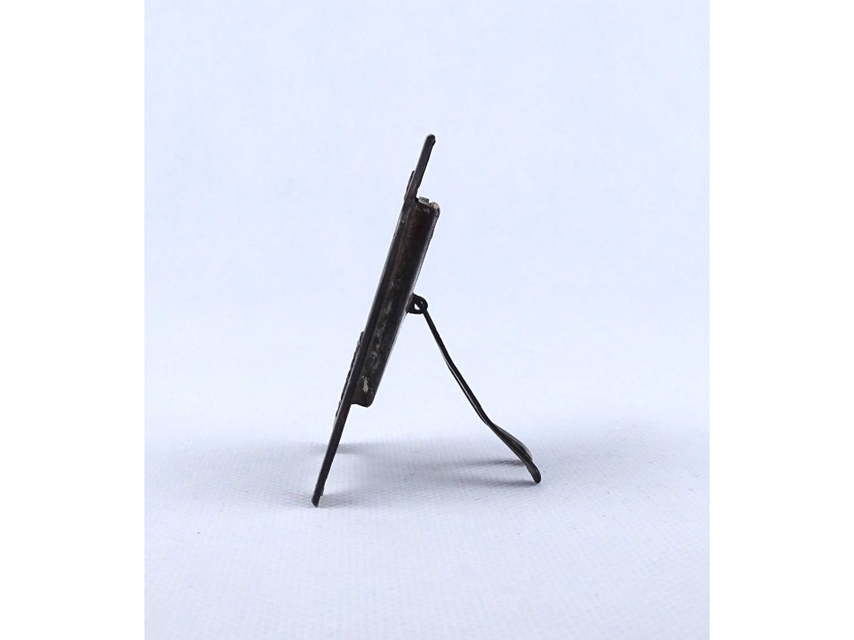 Antik, kisméretű, díszes különleges szecessziós, virágdíszes, acélból készült talpas fénykép keret, fotókeret, keret üveglappal, szép állapotban. Benne egy kisméretű babafotó.
