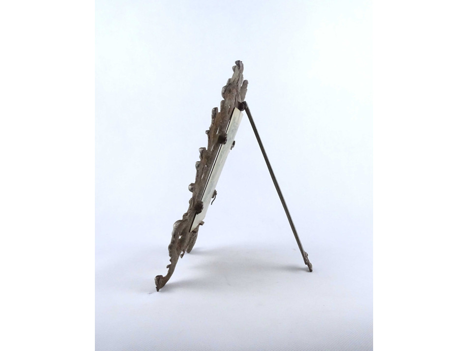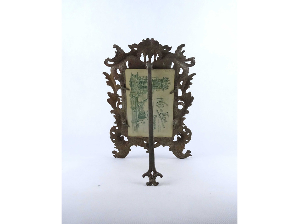 Antik nagyméretű barokk díszítéses állványos öntöttvas fényképkeret, fotókeret behajtható hátsó támasztóval. Benne kisgyermeket ábrázoló antik fotográfia.
