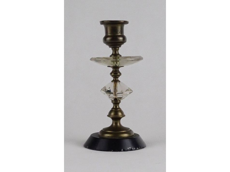 Régi kisméretű gyertyatartó. Csiszoltüveg elemekkel díszített. A gyertyatartó elemeire szedhető, enyhén ferde.