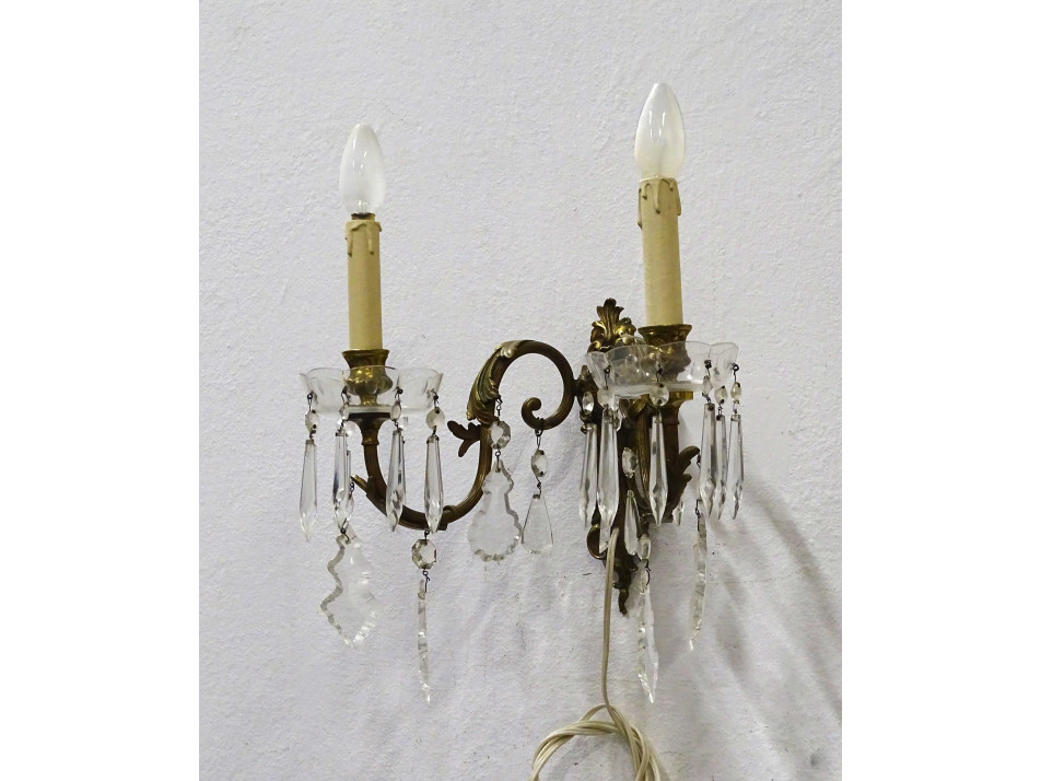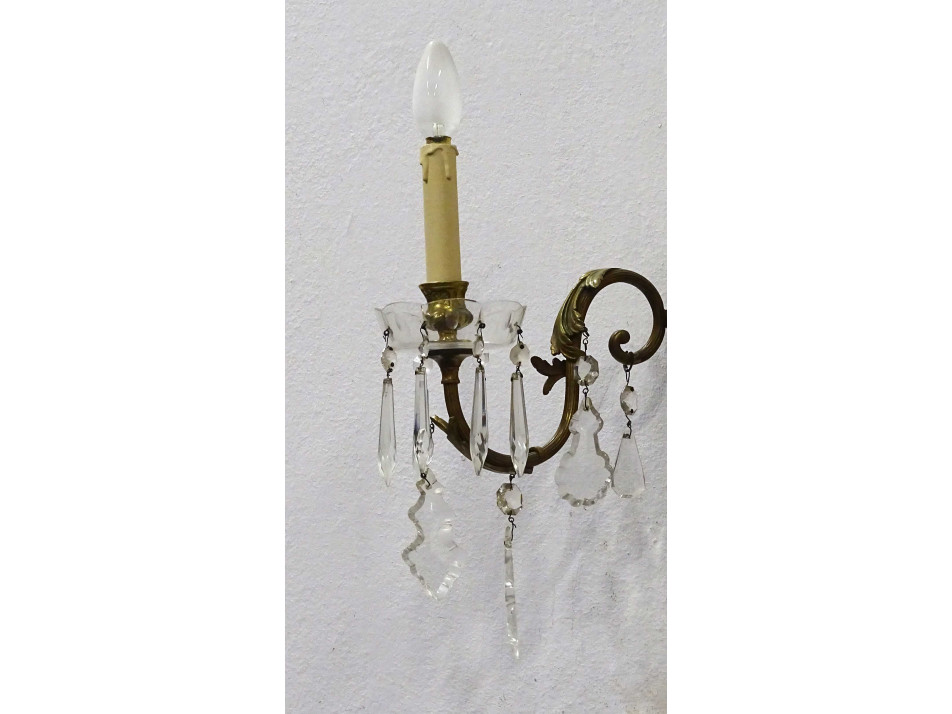 Antik, kétágú falikar kristály függőkkel díszítve. A karok papírmasé gyertyákban végződnek. Kisméretű (E14) izzó való bele. Hiánytalan állapotú, minden függője megvan. A vezetéke mindenképp cserére szorul, jelen állapotában nem lehet a hálózatba dugni, így kipróbálva sem lett.