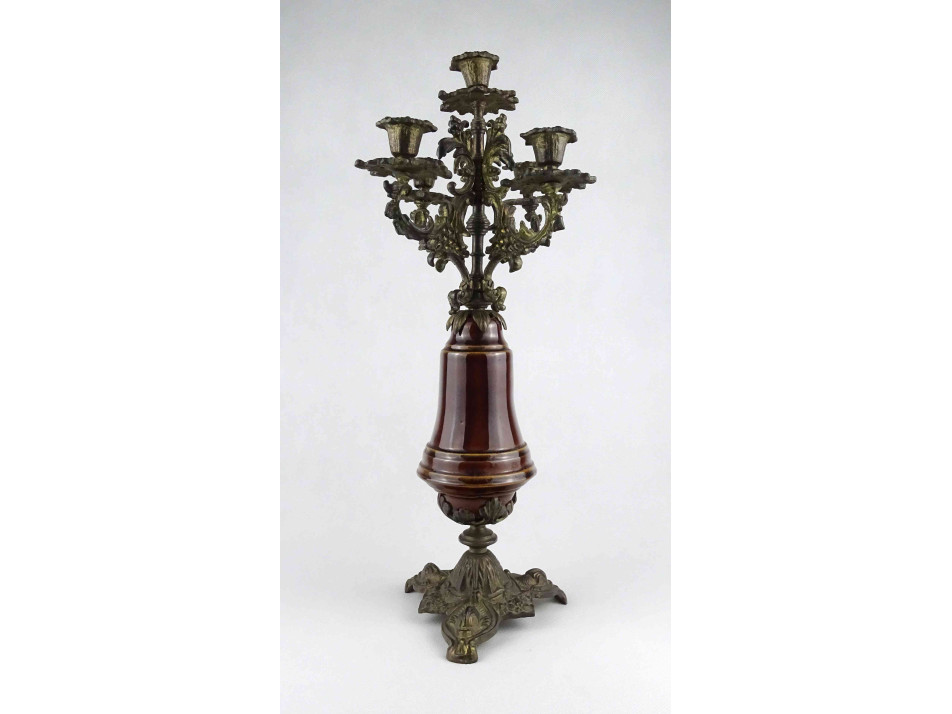 Régi, szép állapotú, ötágú barna mázas kerámia betétes bronz gyertyatartó. Talpát plasztikus delfinfejek díszítik.