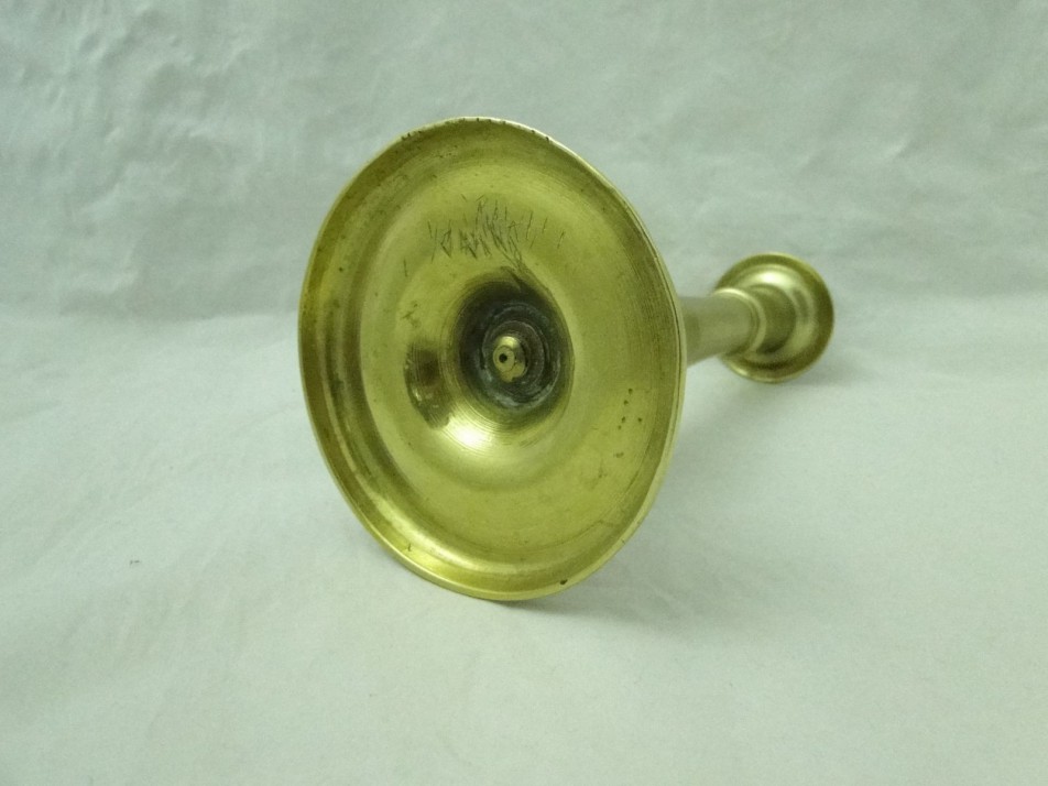 Nagyon régi két darabra szedhető szétcsavarozható réz gyertyatartó. Talpán kisebb horpadás nyomokkal.