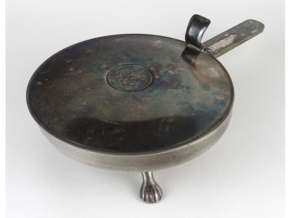 Régi nagyméretű jelzett, ezüstözött, három lábon álló, oroszlánlábas, fedeles, nyeles hamutartó, hamutál.