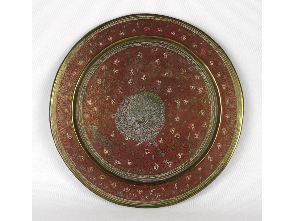 Szép állapotú, vésett virág motívumokkal díszített, festett keleti, indiai réz asztali kínáló készlet. A tálca közepén gyönyörű páva díszítés látható.