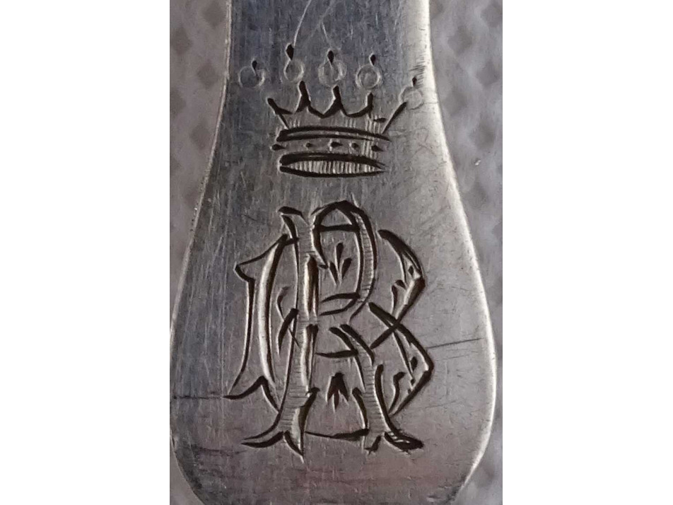 Antik 800-as finomságú, 4 darabos, monogramos ezüst kis kanál, mokkáskanál készlet. Rajta 1937-ig használt, jobbra néző 3-as Diána fejes, 800-as finomság jelzés, mellette " JB " mesterjegy látható.