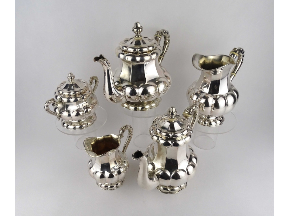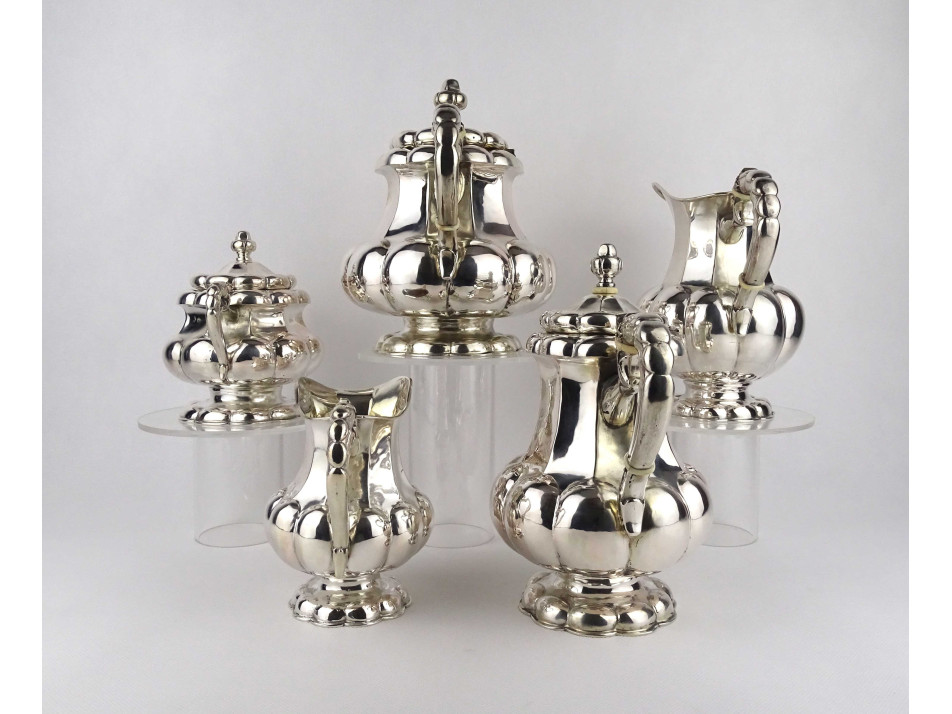 Régi, 800-as finomságú, nagyméretű, domború bordázott mintájú, egységes stílusú ezüst kávés és teás kanna, a hozzájuk tartozó kiöntőkkel és egy fedeles bonbonierrel, gyönyörű, felpolírozott állapotban. Rajtuk 1937-től használt, jobbra néző 3-as Diána fejes, 800-as finomság jelzés, mellette "RJ" mesterjegy látható.