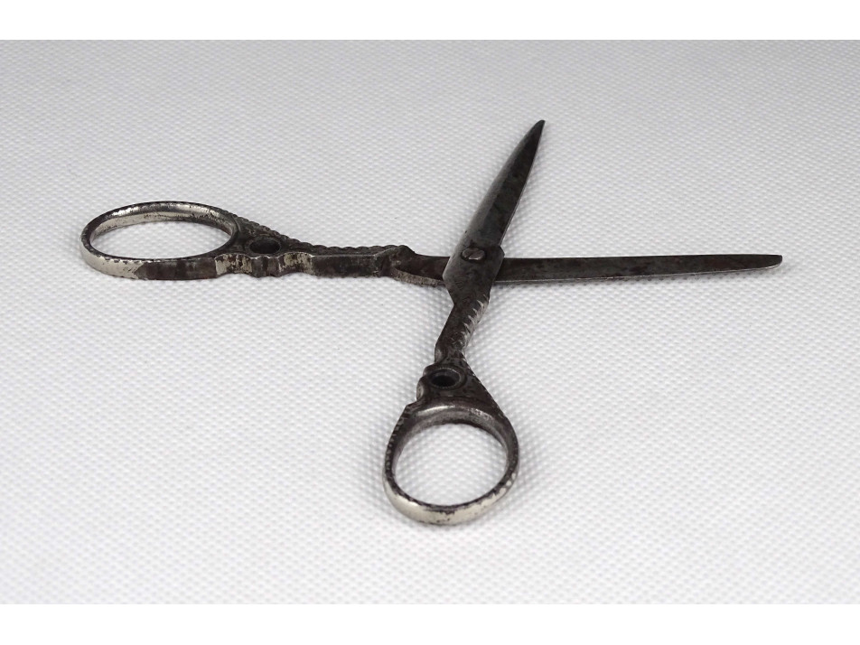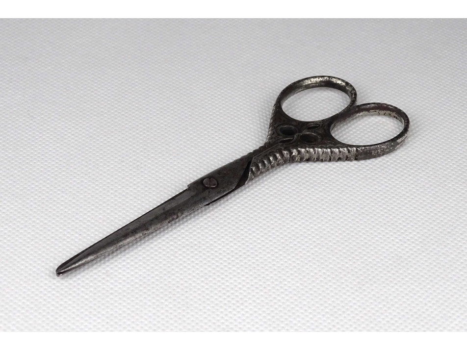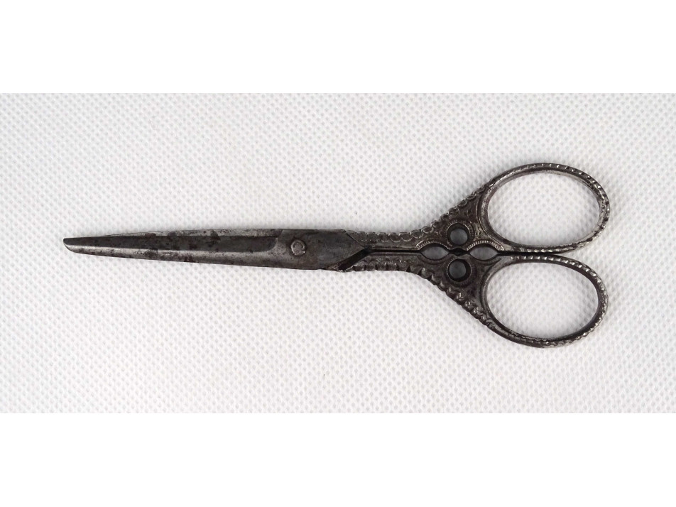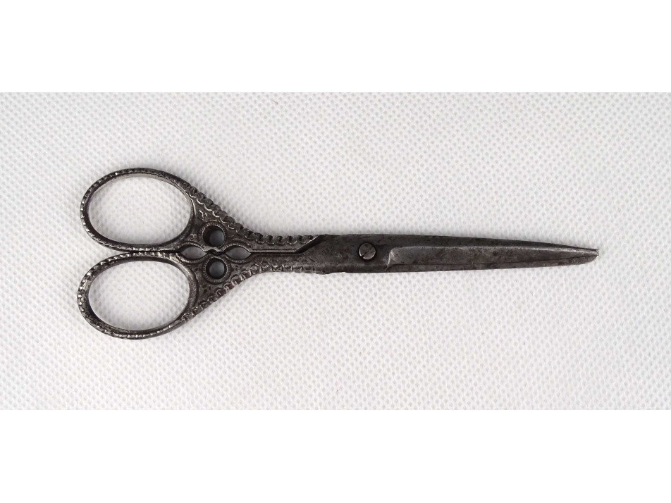Antik, szép állapotban megmaradt, díszes kivitelű, jelzett solingeni apácaolló. Az olló fogó felöli részén középen egy díszes kereszt látható.