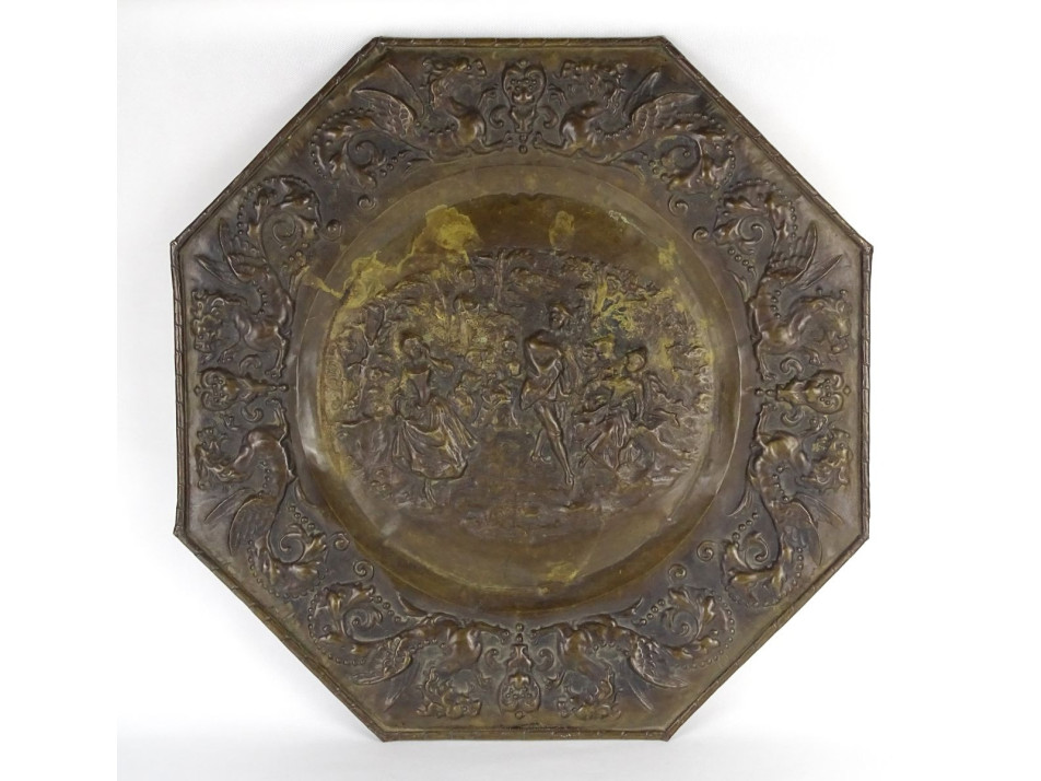 Régi XX. század eleji jelenetes fali réz kézimunka tál. Hajtott széllel, középen 10 alakos jelenet, körben nagy méretű nyolc sárkánydíszítés látható.
