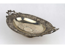 Antik ezüstözött kis méretű, füllel rendelkező bécsi asztalközép kínáló tál, cukros tál az 1920-as évekből.