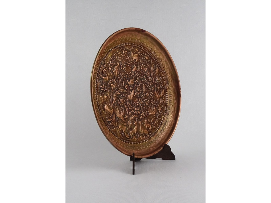 Szép állapotú, állatmotívumokkal sűrűn díszített vörösréz tányér, dísztányér. Gazdag növényi mintázat között összesen 15 állat, őzek és madarak láthatók rajta.