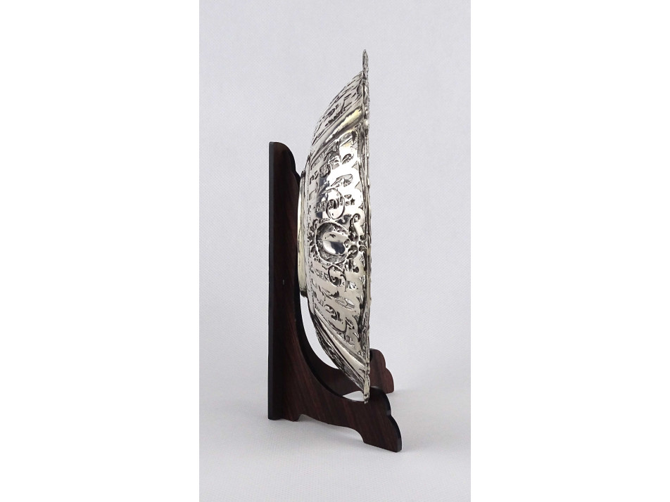 Régi, 800-as finomságú, áttört falú, domborított, angyalkás mintával díszített ezüst kosárka, kínáló kosár, gyönyörű, felpolírozott állapotban. Rajta 1937-től használt, jobbra néző 3-as Diána fejes, 800-as finomság jelzés, mellette " BP HH " mesterjegy látható.
