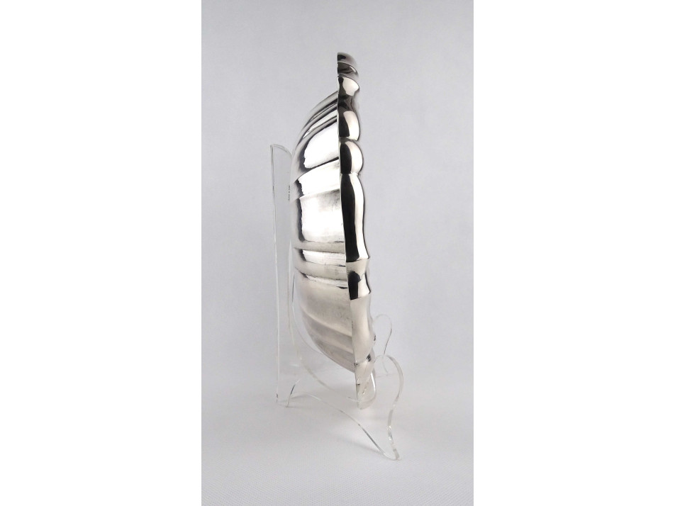 Antik, 800-as finomságú, nagyméretű, kör alakú, magasfalú, bordázott ezüst tál, gyümölcstál, asztalközép. Rajta az 1937-ig használt, jobbra néző 3-as, A betűs Diána fejes, 800-as finomság jelzés, mellette elmosódott mesterjegy látható.