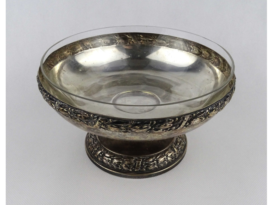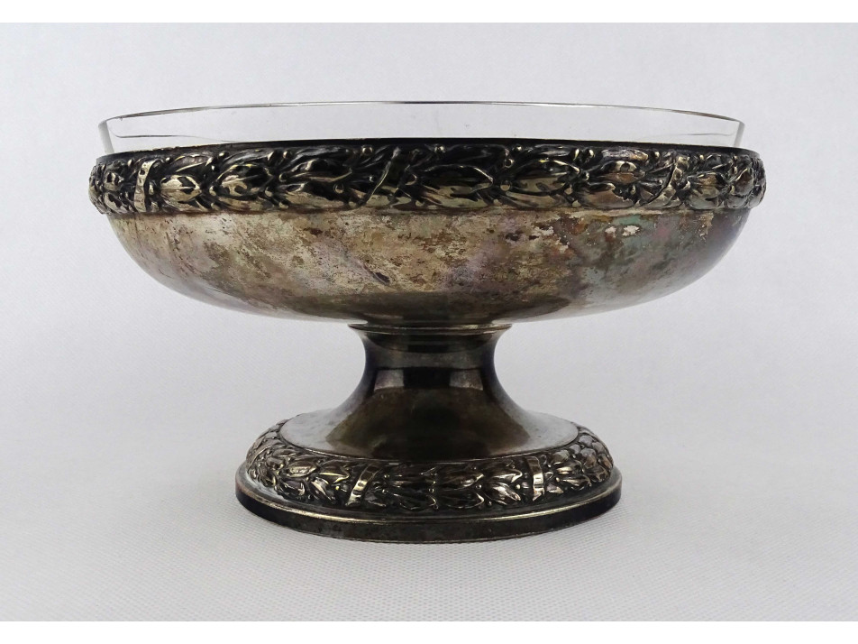 Antik, jelzett, üvegbetétes, ezüstözött fém, körben virágfüzérrel díszített gyümölcskínáló tál, asztalközép.