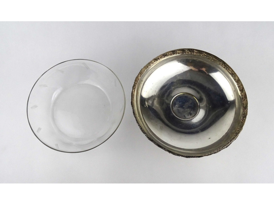 Antik üvegbetétes ezüstözött fém asztalközép gyümölcskínáló tál