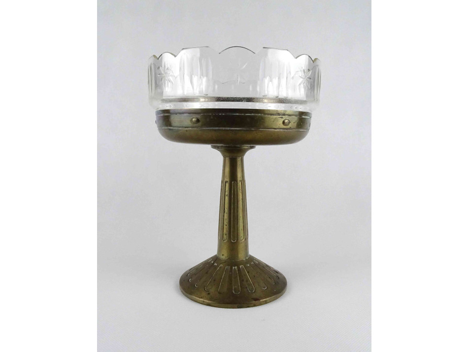 Antik, jelzetlen, sárgarézből készült, egy oszlopon álló talpas kínáló tál, asztalközép, csiszolt üvegbetéttel. A réz felületek patinásak, az üvegtál peremén egy lepattanás látható.