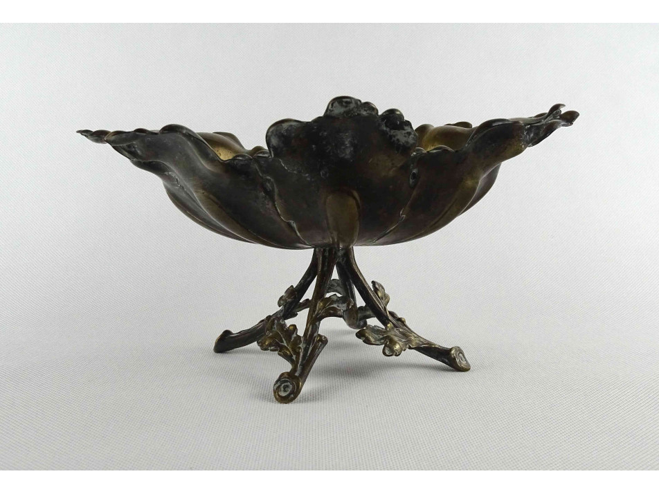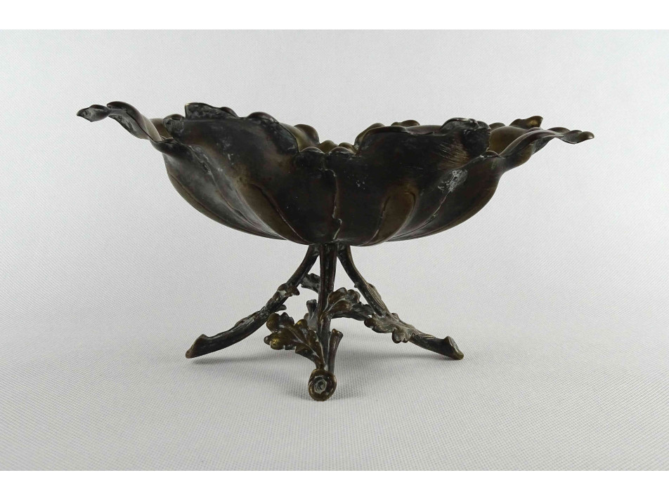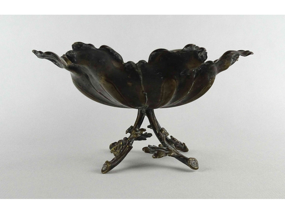 Antik, szép állapotú, rézből készített, nyolcszögletű, plasztikus levelekből összeálló, négy, ágakat formázó lábon álló, részletes kidolgozású asztalközép kínáló, gyümölcskínáló tál.