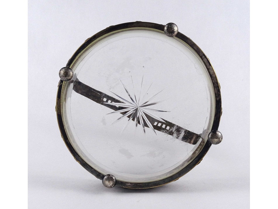 Régi ezüstözött üvegbetétes bécsi rózsás réz osztrák kínáló kosár