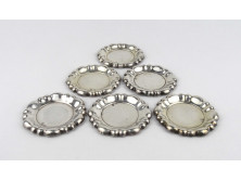 Antik, 13 lattos domború virágmintával gazdagon díszített bécsi ezüst, talpas szószos vagy fűszertartó tálka pár. Rajtuk 1846-os bécsi 13 latos fémjel, mellette elmosódott mesterjel látható.