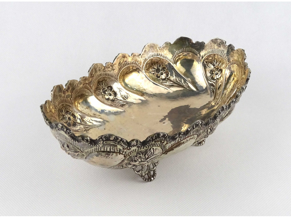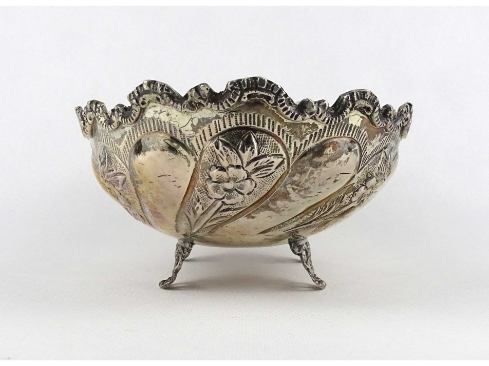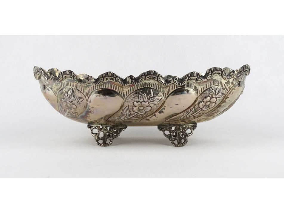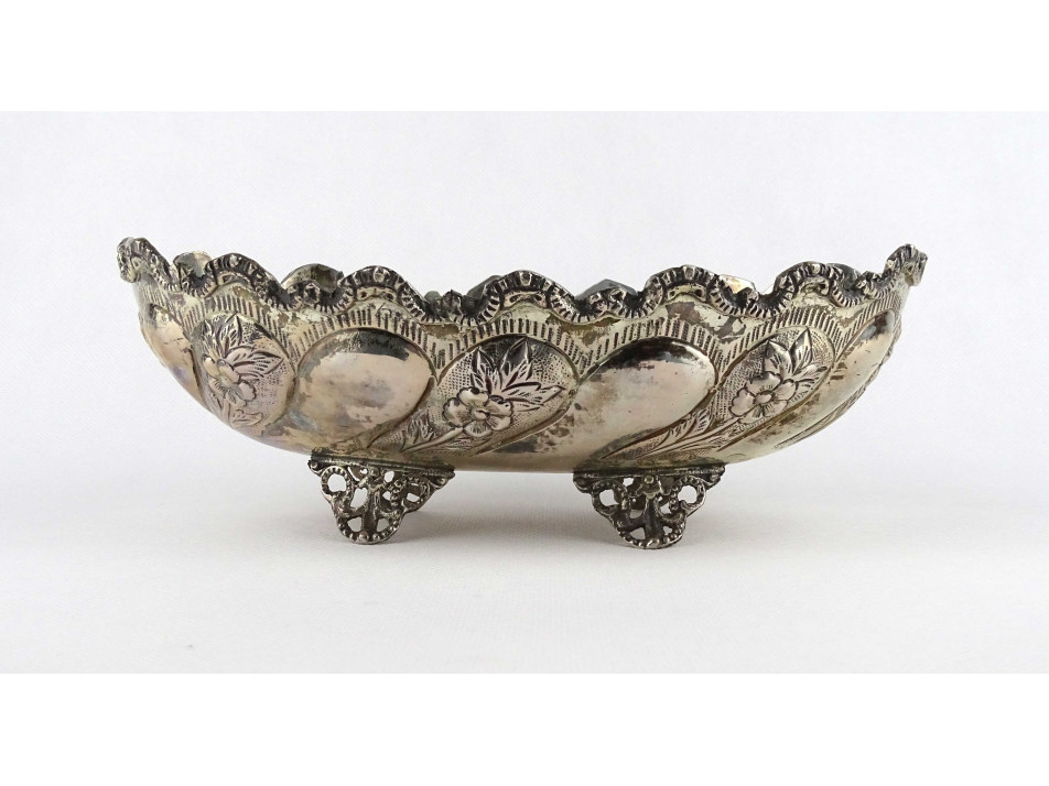 Antik, négy lábon álló, cizellált, domborított virágdíszes, 800-as finomságú ezüst asztali kínáló tál, asztalközép. Alján felülről beütött, erősen kopott 800-as finomságú ezüst jelzés, mellette mesterjegy, lásd fotó.