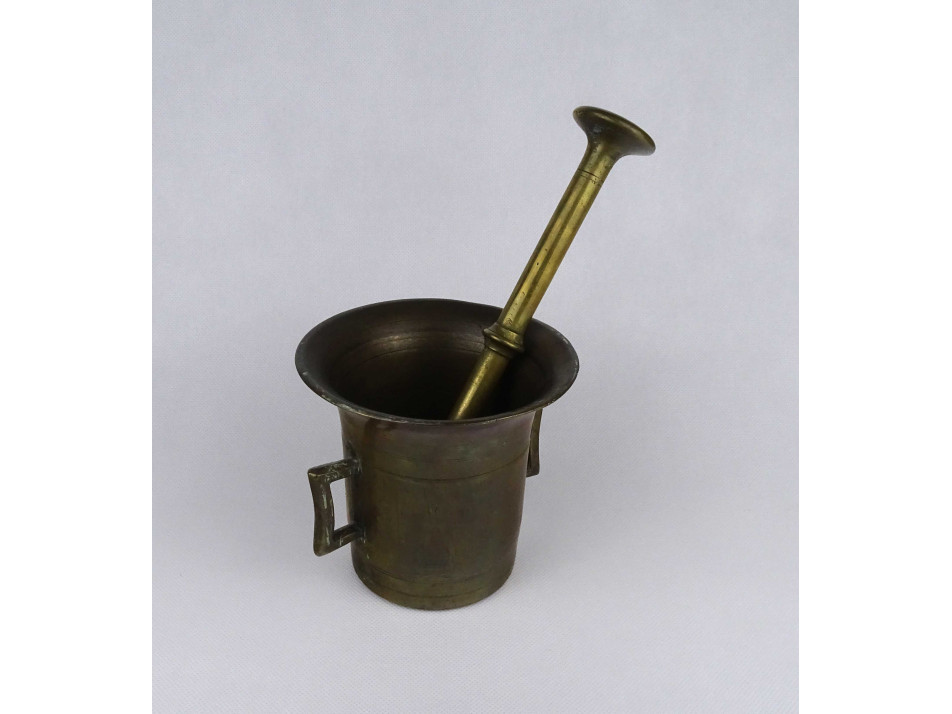 Antik, szögletes fülű, szép állapotú közepesen nagy méretű réz mozsár törővel.