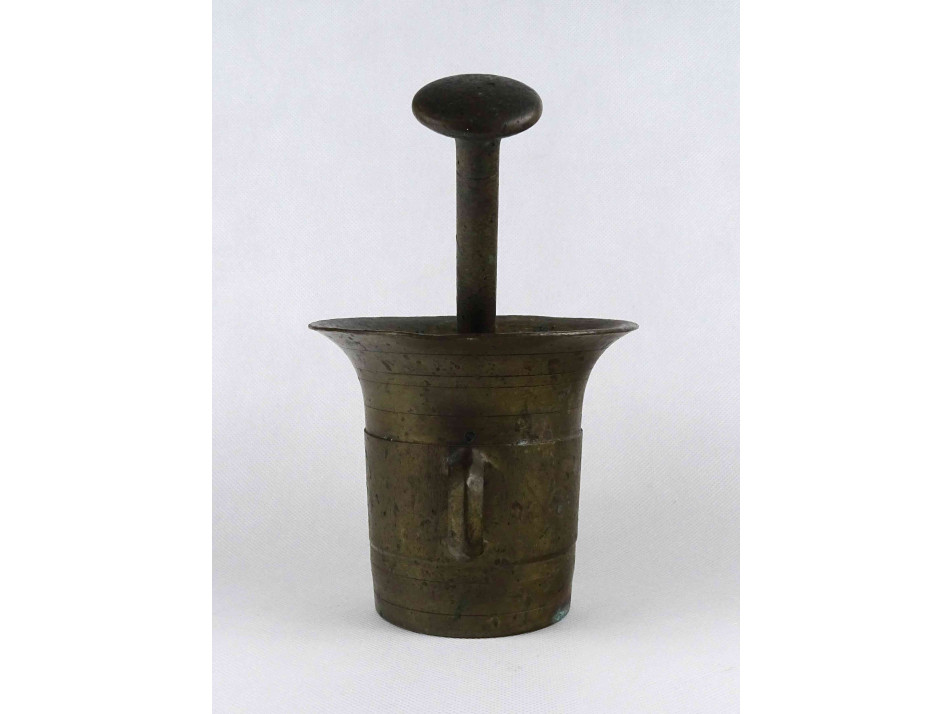 Ritkán előforduló, bronz mozsár fajta. Szögletes fülű, oldalán kalapált díszítésű, patinás bronz mozsár.