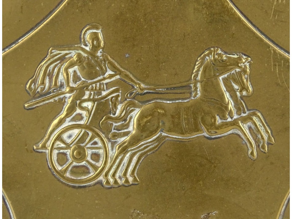 Régi réz morzsalapát. Rajta szecessziós díszítés látható. A lapát akasztóval rendelkezik. Rajta domború római harckocsi díszítés.